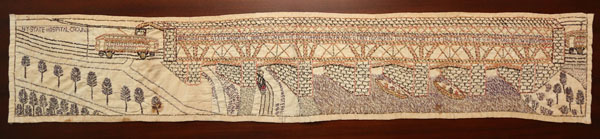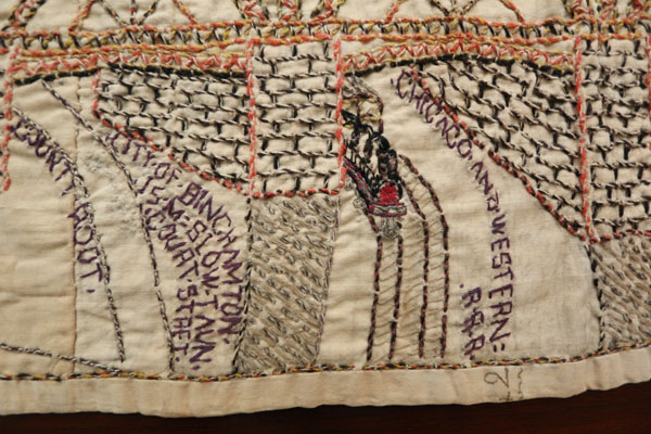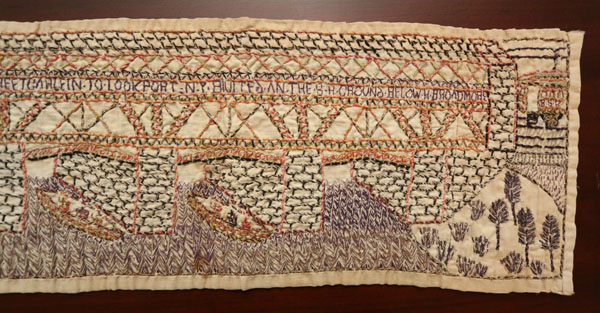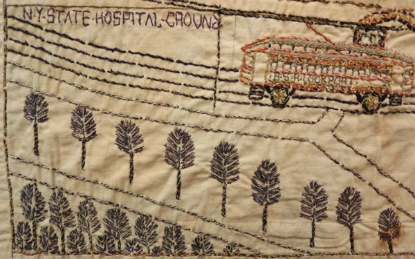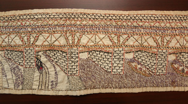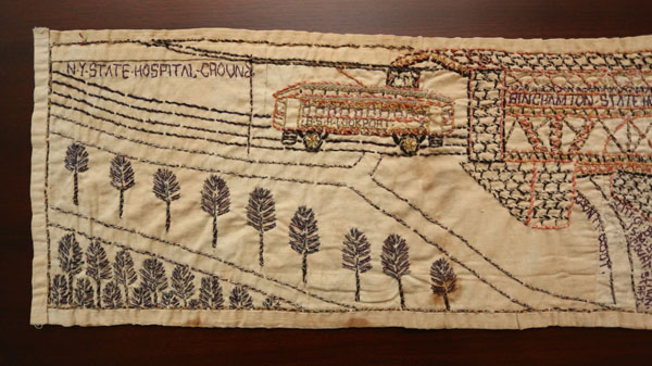 The left side of the image shows a trolley car approaching a bridge. BSH (Binghamton State Hospital), and LOCKPORT (a town in Western New York) appears on the side of the trolley. The following text appears on the stone bridge: “Binghamton State Hospital bricece over the Succohano River and street car lein to Lockport N.Y. Builted in the S H ground below Broadmore.” A road, train and two boats are pictured below the bridge with the following text: “County root,” “City of Binghamton 15 M Slow Taun Court Street,” and “Chicago and Western R.R.R.”