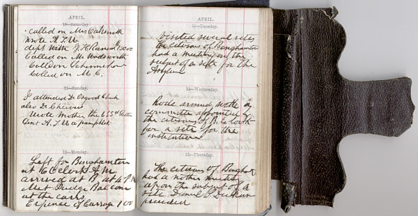 April 13-16 - (Turner visited Binghamton, explored possible sites for the asylum with Judge Bascom and the Binghamton locating committee. Held nightly meetings with the committee at his hotel).